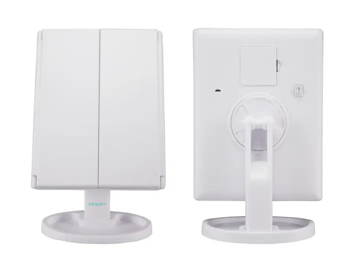 Praktično ogledalo s 22 ugrađene LED svjetleće točke, idealno za šminkanje i svakodnevnu rutinu ljepote i njege lica. 3 razine povećanja (normalno, 2x i 5x), prekidač za uključivanje i isključivanje na dodir i praktična baza za pohranu. Rotira se i naginje za 180° i ima dvostruko napajanje (baterija ili USB) za maksimalnu udobnost.