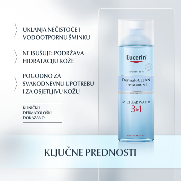 Eucerin DermatoCLEAN [HYALURON] micelarna otopina brzo je i praktično rješenje za čišćenje pogodno za sve tipove kože, a klinički i dermatološki dokazano i za osjetljivu kožu.