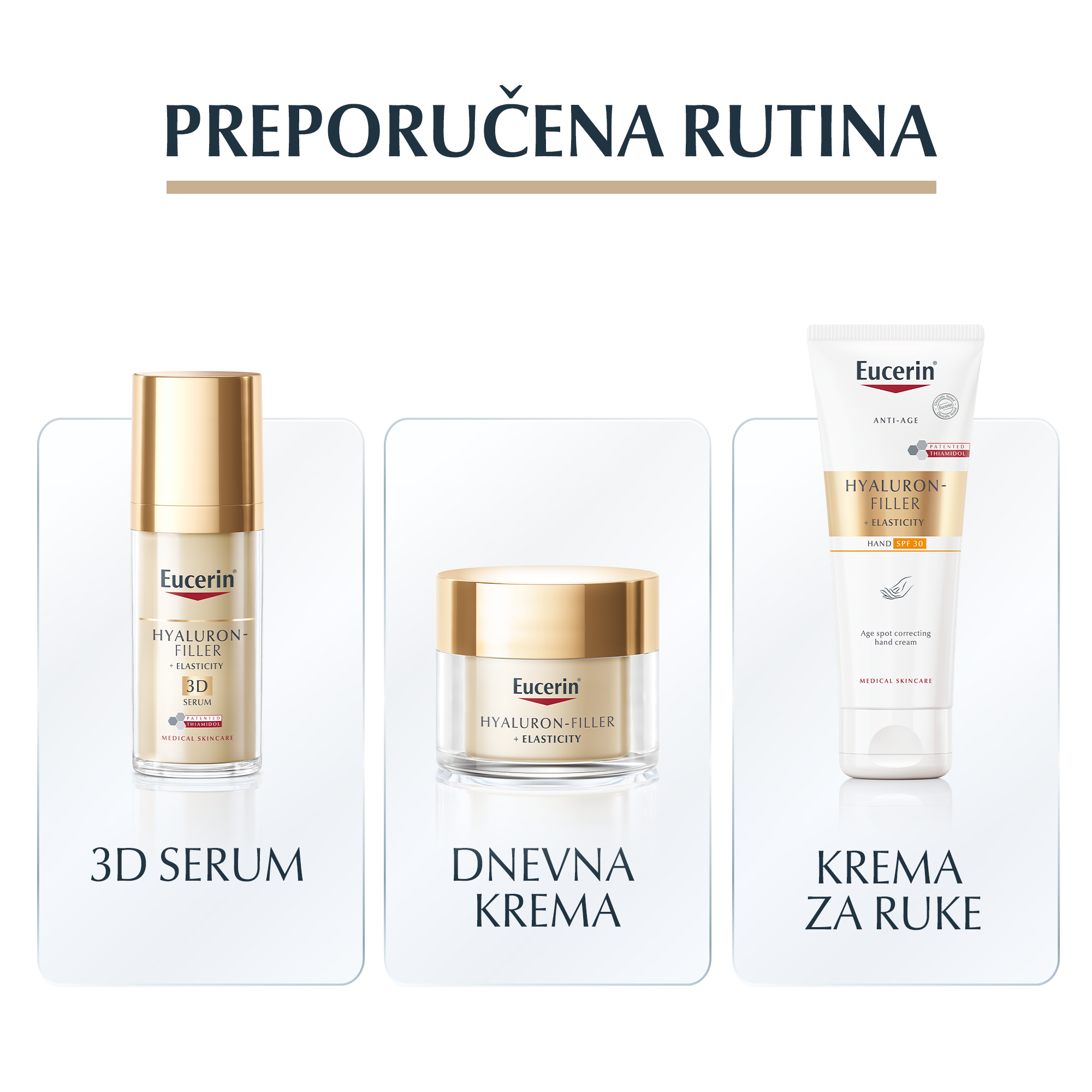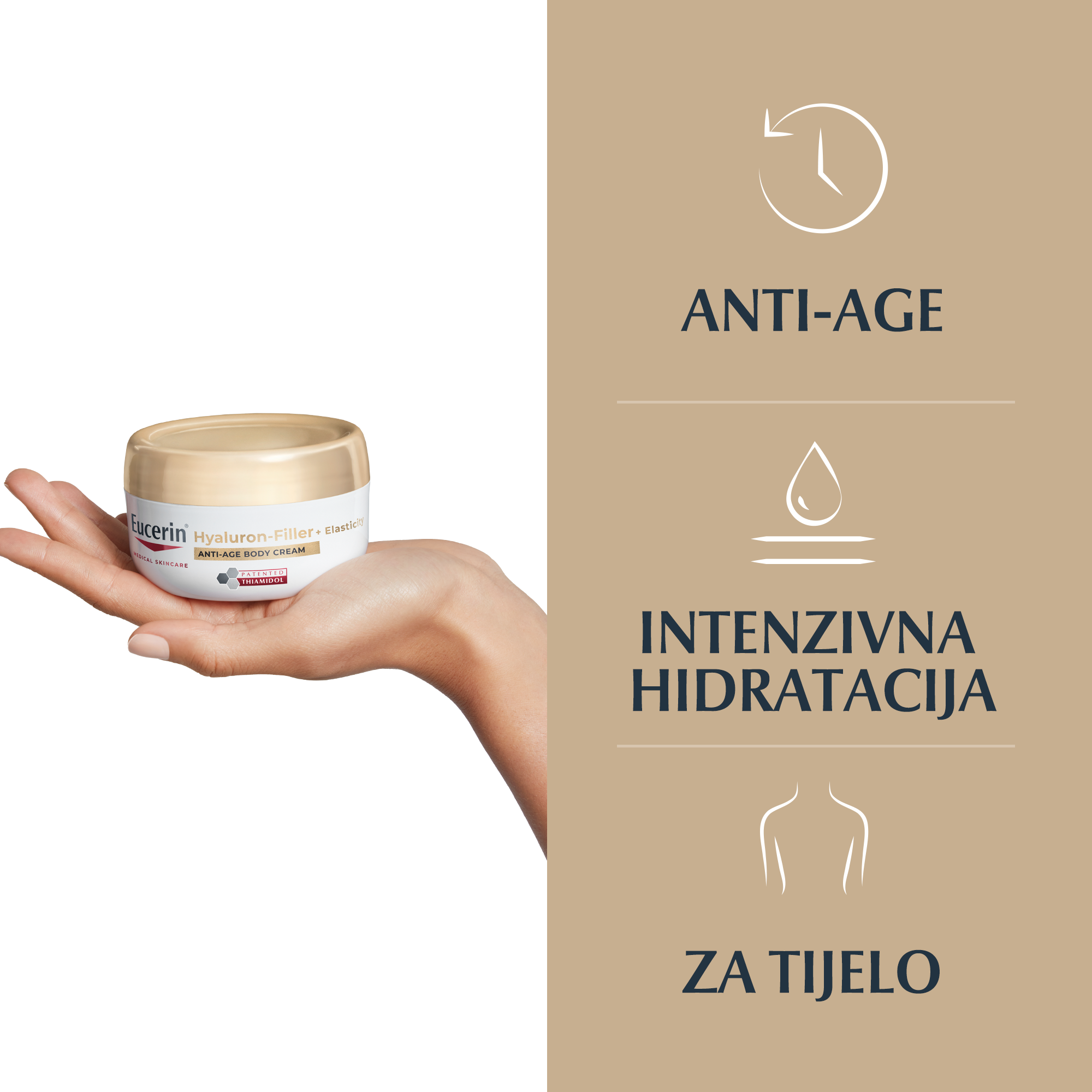 Eucerin Hyaluron-Filler + Elasticity Anti-age krema za tijelo svojom inovativnom kombinacijom tri ključna sastojka ciljano djeluje na kožu s trostrukim učinkom, ostavljajući kožu ujednačenom, čvršćom, pomlađenom te glatkom na dodir.