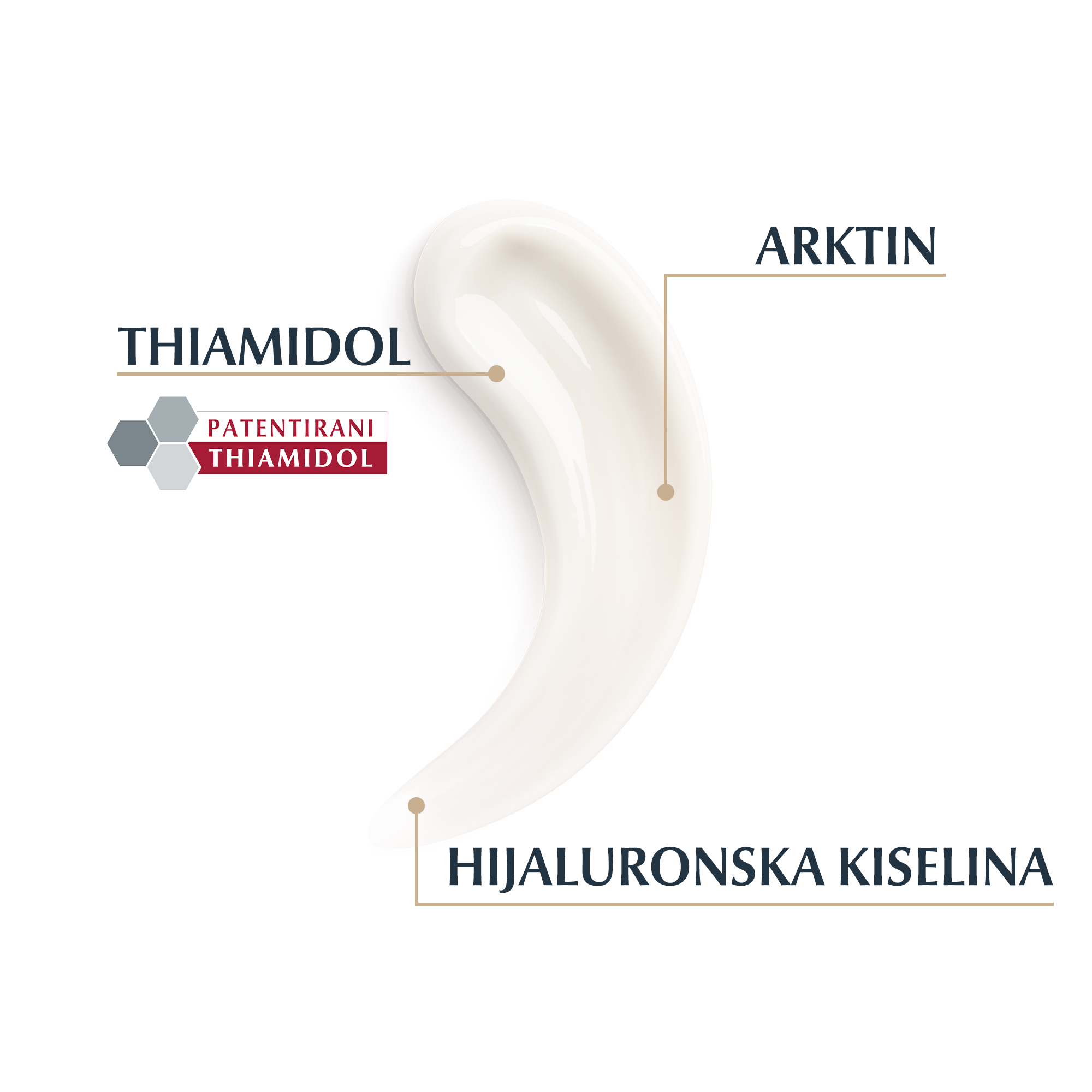 Arktin potiče obnovu kolagena, pomaže u poboljšanju elastičnosti, te djeluje zajedno sa hijaluronskom kiselinom koja osigurava intenzivnu hidrataciju i glatku kožu.