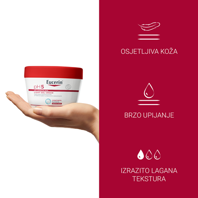 • Koristite pH5 laganu gel kremu ako… Imate suhu i osjetljivu kožu tijela, skloni ste alergijama tipa 1 i želite izbjeći kreme s ljepljivim ili masnim tragovima: Eucerin pH5 lagana gel krema za tijelo pruža dugotrajnu hidraciju, čini kožu otpornijom i manje osjetljivom na okolišne okidače bez ostavljanja ljepljivog ili masnog traga.