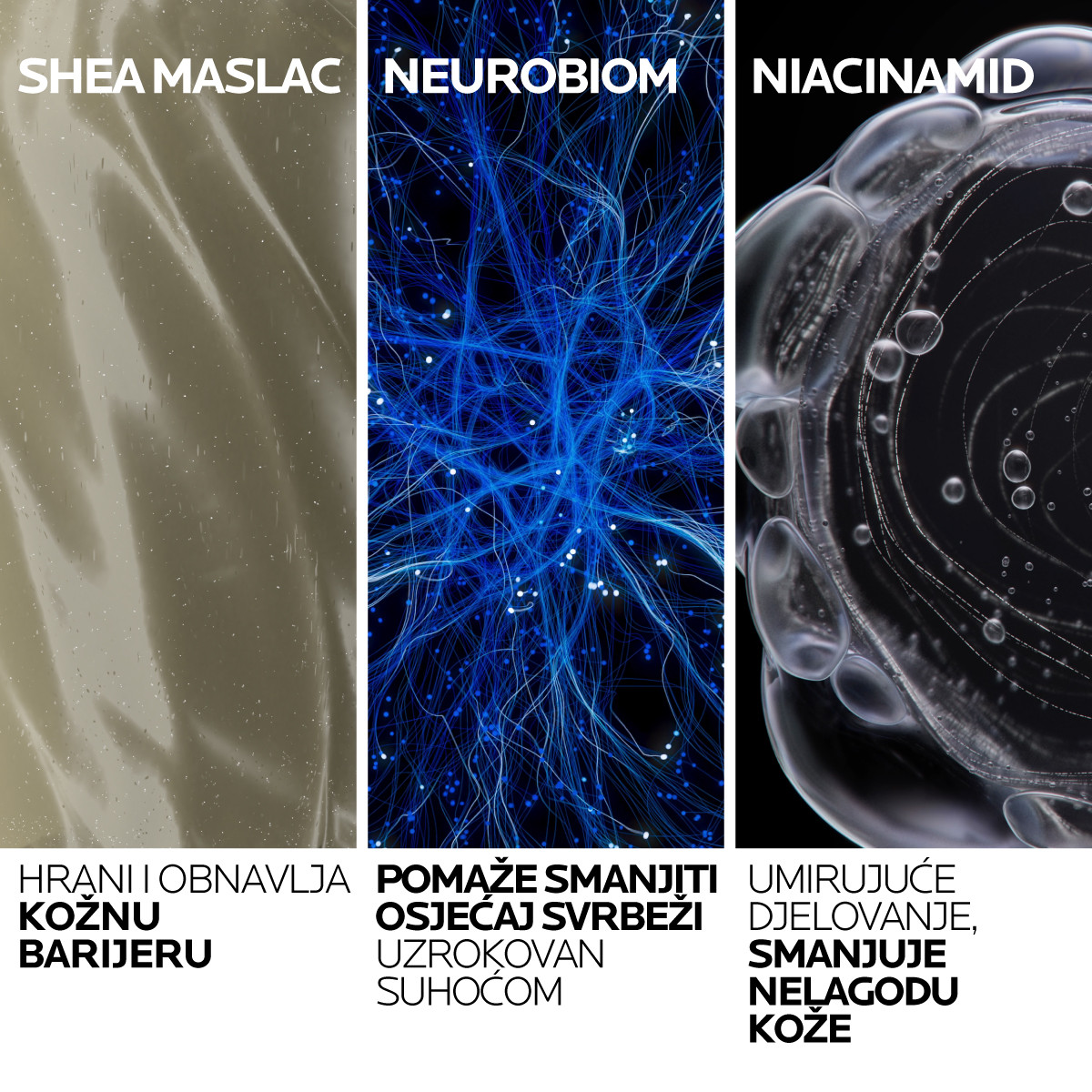 SASTOJCI: AQUA / VODA • BUTYROSPERMUM PARKII MASLAC / SHEA MASLAC • GLICERIN • DIMETIKON • NIACINAMID • CETEARILNI ALKOHOL • ULJE DIVLJE OGRŠTICE (BRASSICA CAMPESTRIS) / ULJE ULJANE REPICE • GLICERIL STEARAT • AMONIJEV POLIAKRILOILDIMETIL TAURAT • PEG-100 STEARAT • PROPANEDIOL • EKSTRAKT KORIJENA ZMIJOBRADA (OPHIOPOGON JAPONICUS) • EKSTRAKT GRAŠKA (PISUM SATIVUM) • SORBITAN TRISTEARAT • DIMETIKONOL • PEG-20 METIL-GLUKOZA SESKVISTEARAT • NATRIJEV KLORID • CIKLODEKSTRIN • MANOZA • KOKO-BETAIN • DINATRIJEV EDTA • KAPRIOIL GLICIN • KAPRILIL GLIKOL • FERMENT MIKROORGANIZMA VITREOSCILLA • MALTODEKSTRIN • KSANTAN GUMA • TOKOFEROL • PENTAERITRITIL TETRA-DI-T-BUTIL HIDROKSIHIDROCINAMAT.