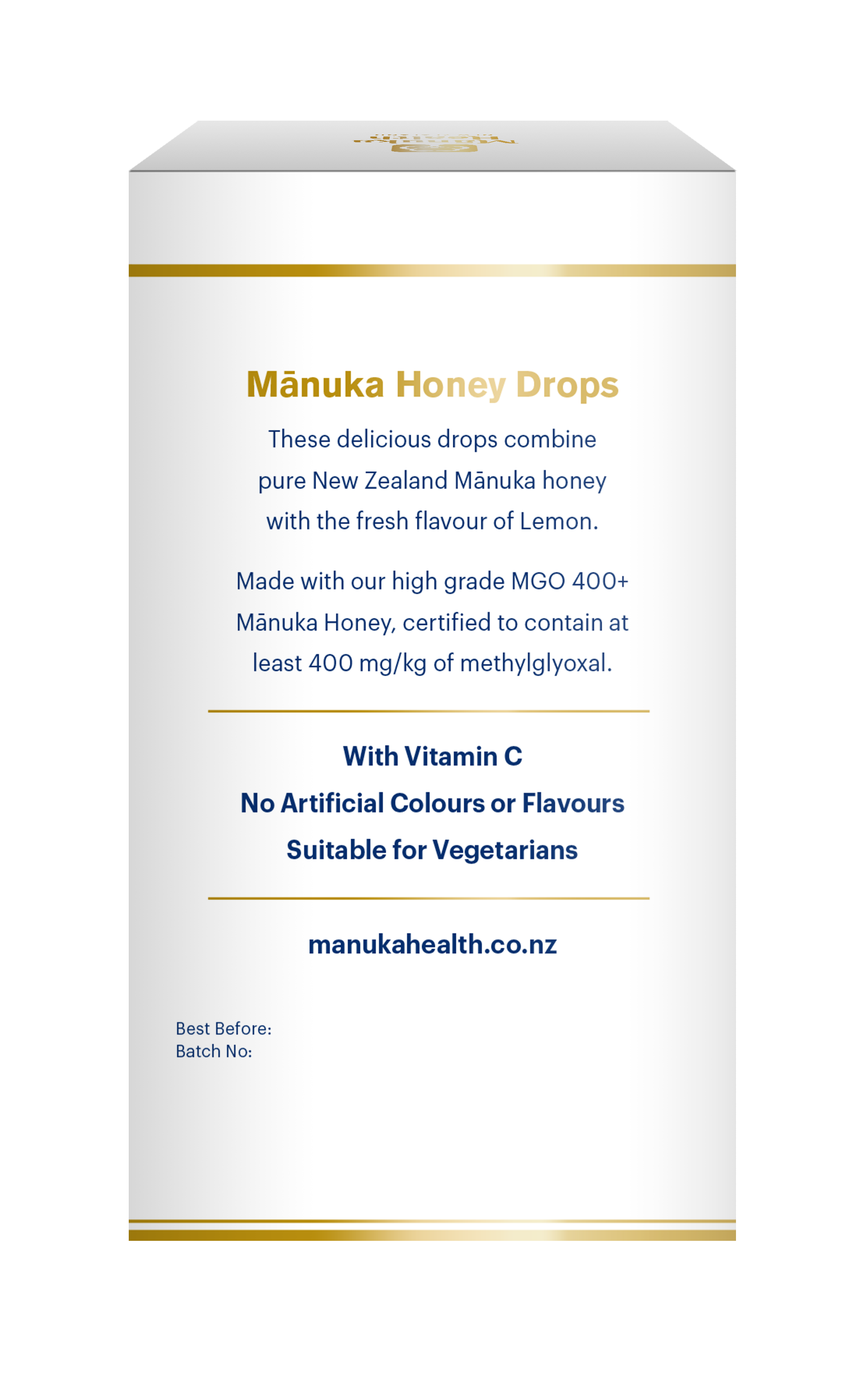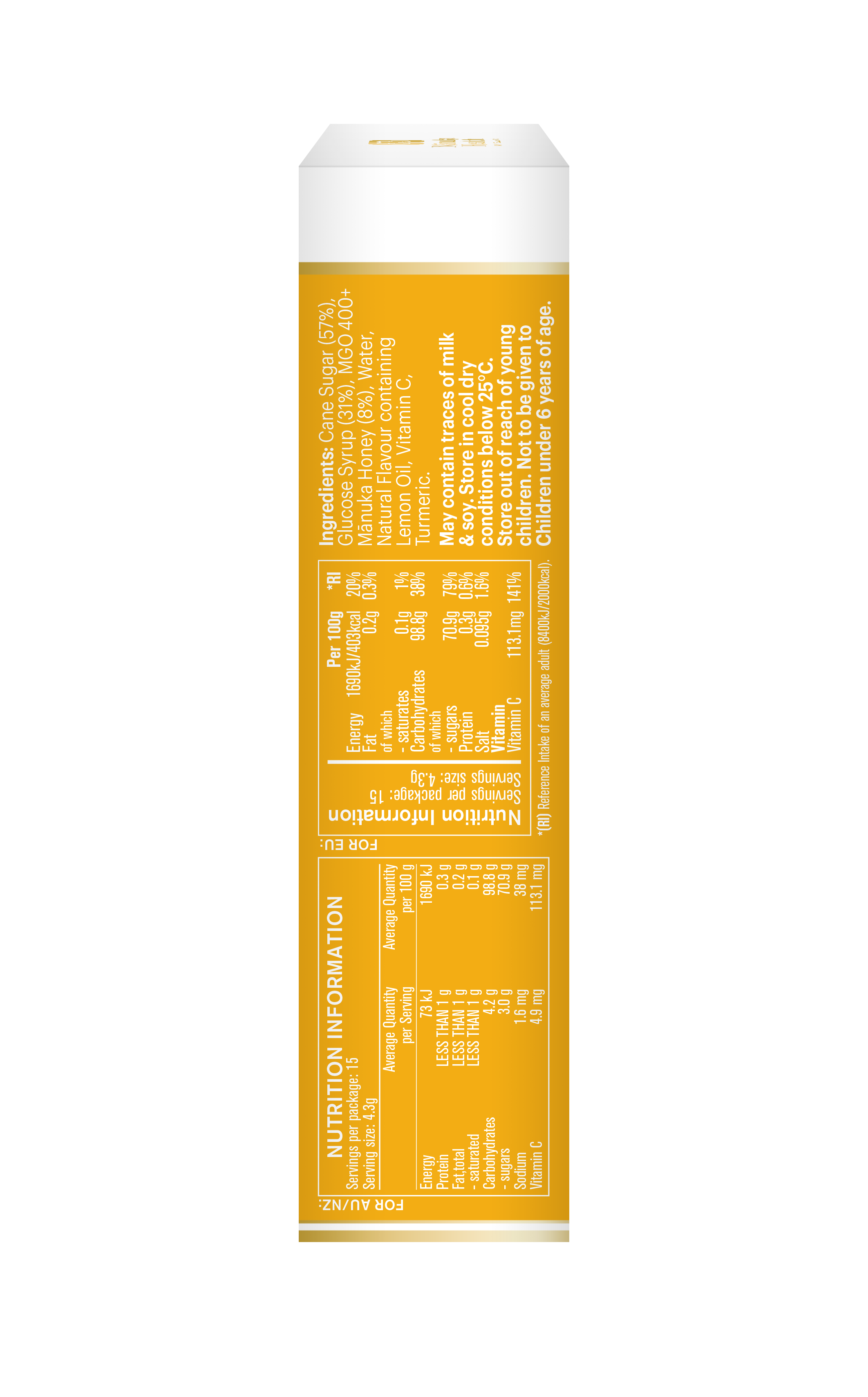 Sastojci: saharoza (šećer trske), glukoza, med Leptospermum scoparium (MGO ™ 400+ med od manuka 8%, 345 mg), citrus medica limunum (prirodno limunsko ulje), voda, vitamin C (askorbinska kiselina), Curcuma longa (kurkuma). Hranjiva vrijednost po 100 g proizvoda: Energija 1690Kj / 404kcal, od čega masti 0,2 g zasićenih 0,1 g, ugljikohidrati od kojih 99 g šećera 71 g, proteina 0,3 g, soli manje od 0,1 g.