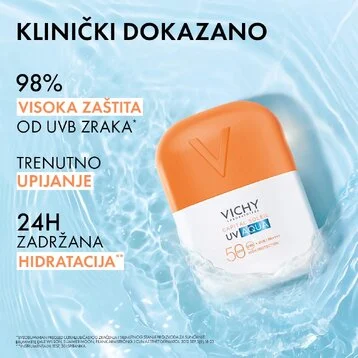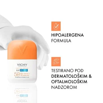 Novi UV AQUA NEVIDLJIVI FLUID SPF 50, hidracijski, svjež, nevidljivi fluid za lice s dnevnom UV zaštitom. Ovaj SPF je lagan, svjež i nevidljiv baš poput vode. Zaštita od UVA, UVB zračenja, onečišćenja i oksidacijskog stresa. Pruža dugotrajnu hidraciju u vodenastoj teksturi koja je nevidljiva na svim fototipovima i trenutno se upija (5 sekundi*). Otporan na vodu, hipoalergen i pogodan za područje oko očiju i kapke. Precizan aplikator za najugodnije iskustvo pri nanošenju. Neodoljiv miris.