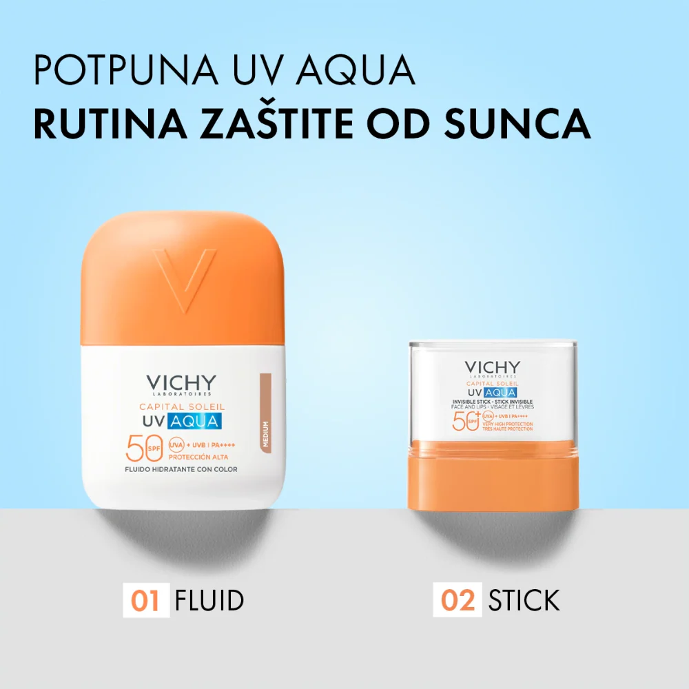 Novi UV AQUA NEVIDLJIVI FLUID SPF 50, hidracijski, svjež, lagano tonirani fluid za lice s naprednom dnevnom UV zaštitom. Ovaj SPF je lagan, svjež i nevidljiv baš poput vode. Zaštita od UVA, UVB zračenja, onečišćenja i oksidacijskog stresa. Pruža dugotrajnu hidraciju u vodenastoj teksturi koja je nevidljiva na svim fototipovima i trenutno se upija. Otporan na vodu, hipoalergen i pogodan za područje oko očiju i kapke. Precizan aplikator za najugodnije iskustvo pri nanošenju. Neodoljiv miris.